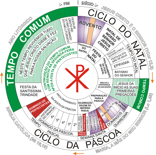 O Tempo Comum se compõe de 33 ou 34 semanas. Começa depois da Festa do Batismo de Jesus e vai até a terça-feira antes da Quaresma. Recomeça na segunda-feira após a festa de Pentecostes e se prolonga até a véspera do primeiro domingo do Advento. É comum, mas importantíssimo para o sustento. Não é extraordinário. É o dia a dia. E nos mostra que Deus se faz presente nas coisas simples. “O Reino de Deus não vem de forma ostensiva...” (Lc 17,20). Durante esse tempo, celebramos a ação de Jesus no mundo, a presença de Maria (modelo de fé, figura da Igreja), o testemunho dos santos (irmãos, benfeitores e modelos).